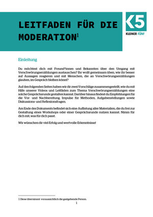 In unserem Leitfaden zur Durchführung von Gesprächsrunden für einen besseren Umgang mit Verschwörungserzählungen findet ihr weitere Hinweise zur Durchführung eigener Workshops, Tipps und Tricks zur Vor- und Nachbereitung und Hintergrundinformationen zu unseren Materialien.